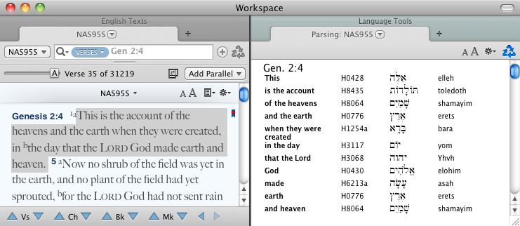 To select words or a reference and search for the selection in the text or tool of your choice. You can select the resource in the Library or Amplify menus. A triple-click is a shortcut which amplifies to the top tool of the relevant category. menu, click Language>Parsing. A Parsing tab opens displaying the Key Number and Hebrew equivalent of every selected word. - Had you selected text in a pane containing a grammatically tagged Greek or Hebrew text, the parsing tab would have displayed the lexical form