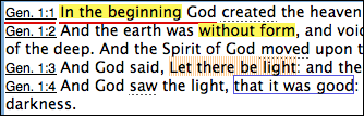 Highlights can be applied to any Bible Text, and to any other Texts in the Text pane of the Search tabClosed The core tab used to search Bible texts, it consists of a search entry area and a search results area or other tabs. When words are highlighted in an activeClosed The application, window, tab, or other screen element which is currently being used; sometimes called the "front" or "frontmost" screen element pane, any other Texts displaying the same version and verse are also highlighted. Once applied, the highlighting is automatically saved and displayed whenever that version is reopened.