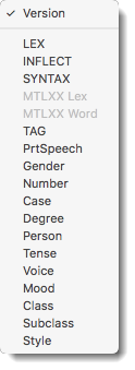 - Grammatically Tagged Texts: Grammatically tagged texts offer more items, though only one class can be selected. This pop-up menu shows the classes available for Greek texts.